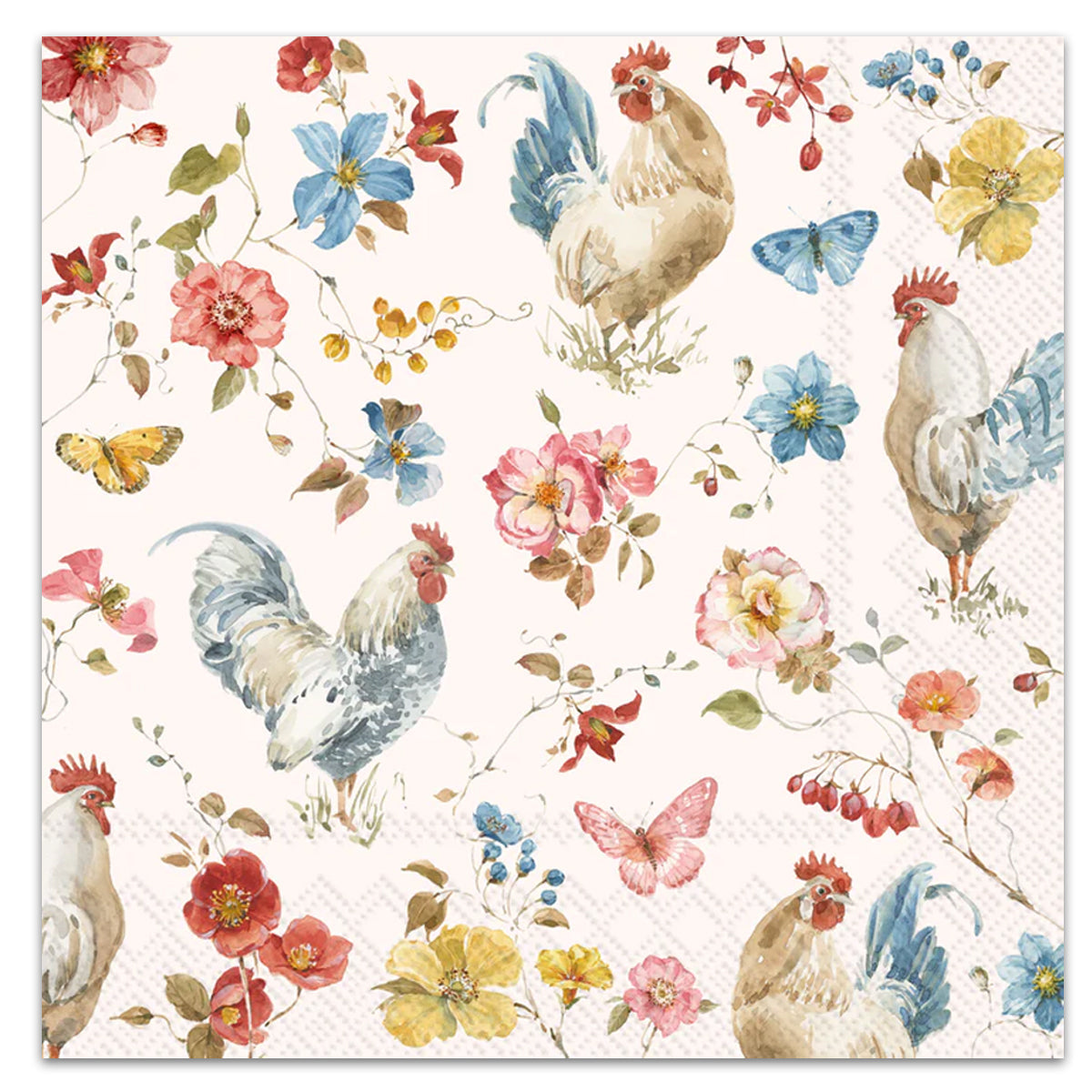 Bring farmhouse cheer to the table with the Country Rooster Napkin, a paper design showcasing painterly roosters, hens and garden florals on a warm cream backdrop. Made of smooth, absorbent paper, they bring effortless style and easy cleanup to everyday meals and casual gatherings. Great gift for the chicken lover! Printed on luxury 3-play paper.