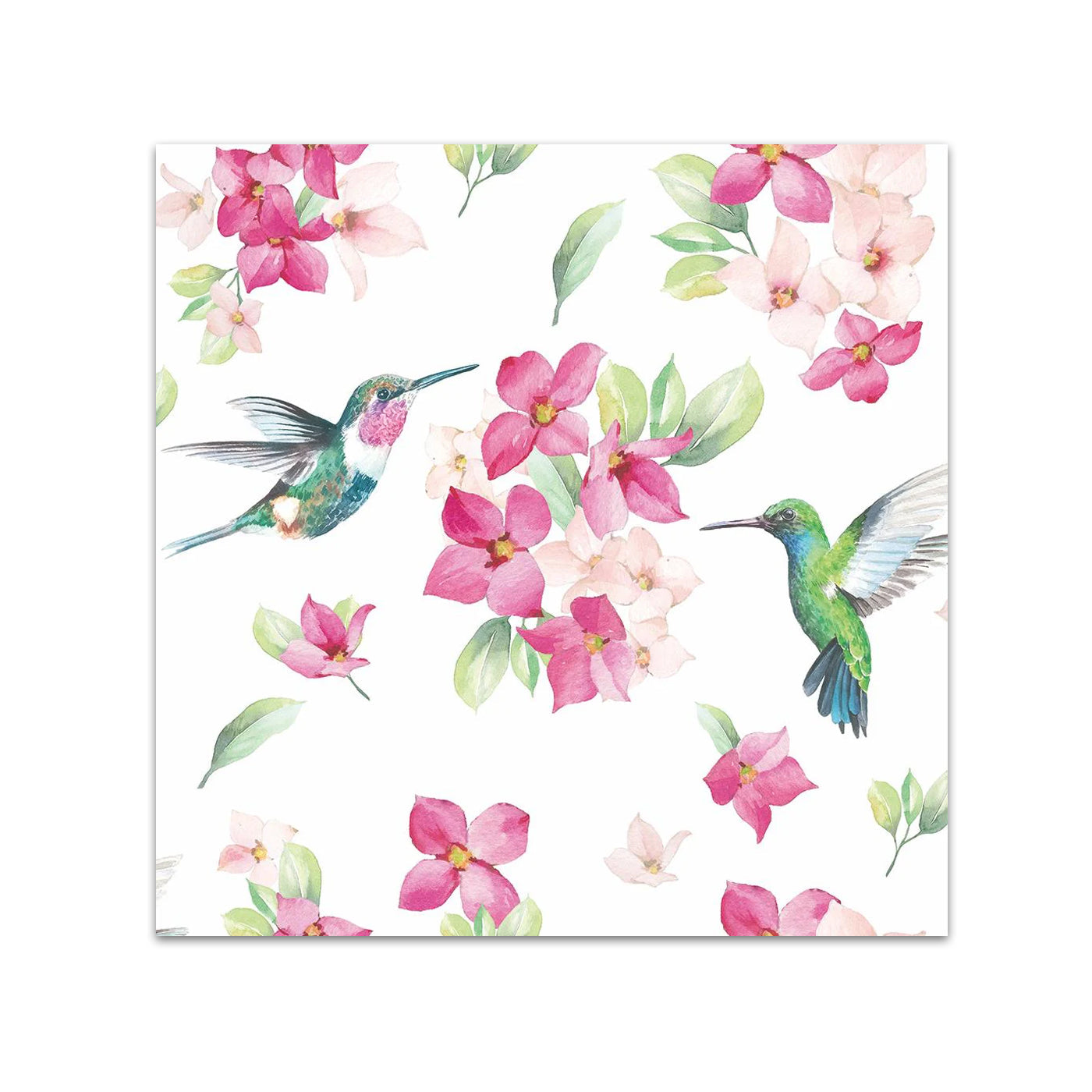 Bring the joy of the garden to your table and into your home with these charming Hummingbird paper napkins. An all-over design of Hummingbirds in flight surrounded by lavish pink flowers on a white background. Perfect addition to your spring and summer entertaining. Lovely gift for the bird lover! Printed on luxury paper.