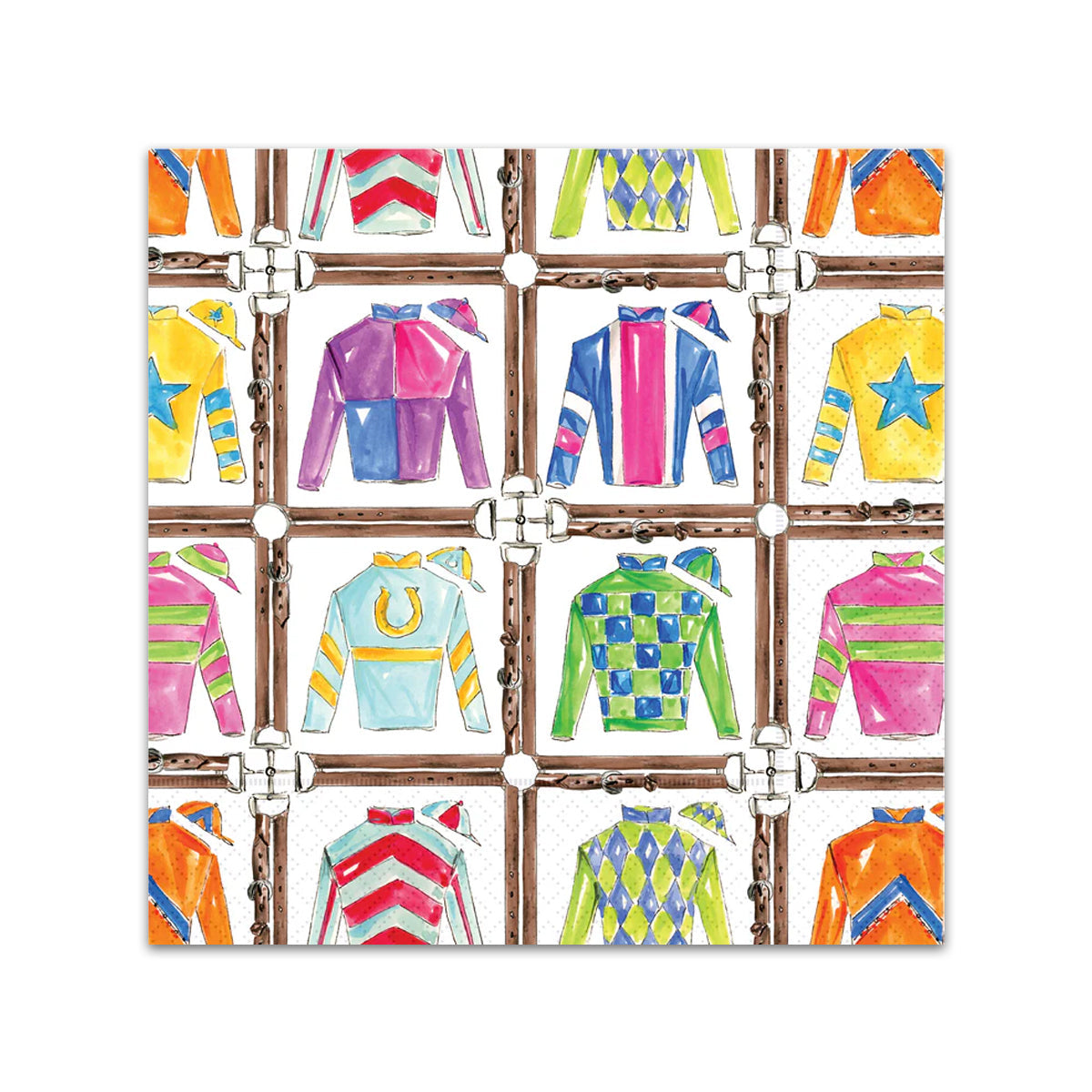 Channel race-day energy with these paper cocktail napkins, featuring vibrant watercolor painting of racing silks framed by bridle motifs. Perfect for your Deby party and polished pours, they add lively equestrian flair to every toast. Printed on luxury 3-play paper.